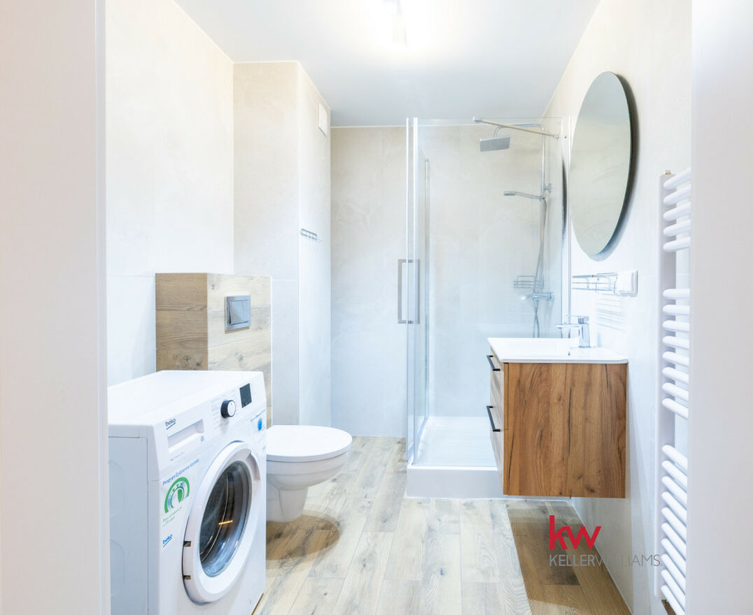 Łazienka jest zaprojektowana nowocześnie i funkcjonalnie a gratis dorzucamy pralkę!